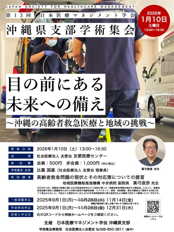 日本医療マネジメント学会は、医療安全、地域医療連携、病院経営、働き方改革など多様なテーマを取り上げ、医療に携わる多職種の連携と国民の健康福祉への寄与を目指して活動しております。沖縄県支部学術集会も、地域の実情を踏まえた具体的な課題解決の場として、今後も発展してまいります。
