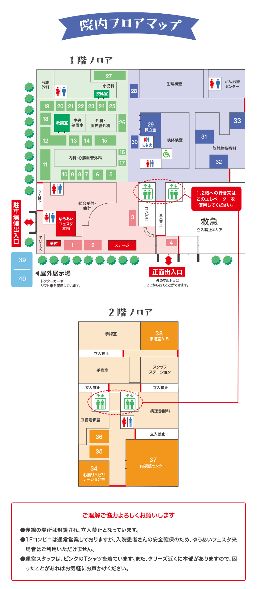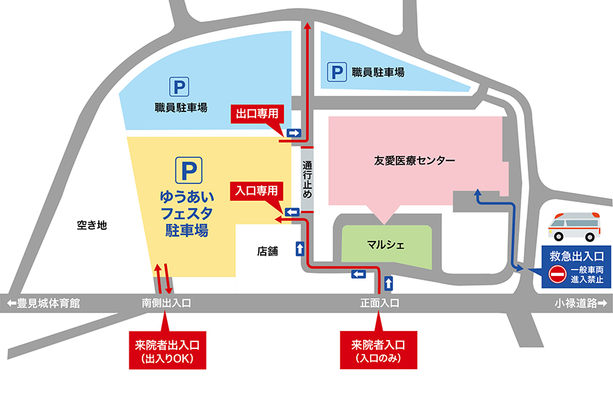 自動車でお越しの方は、外来駐車場をご利用ください。当日10時〜15時限定で駐車場を無料開放します。