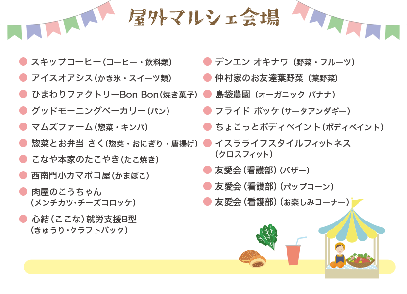 豊見城と糸満のお店が集まるマルシェがゆうあいに出現!飲食やアトラクションなどのおたのしみコーナーで、ゆうあい看護師たちも張り切ってお待ちしてます!
