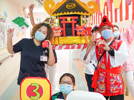 夏祭りやハロウィン、クリスマスの時期にはスタッフが仮装して病棟をまわります。入院生活でも季節を感じられるイベントを企画しています。