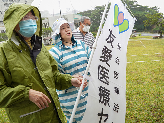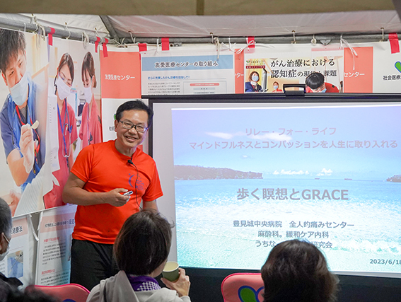 友愛会職員もウォークへの参加、バザー出展、ブースでの講演を行い、豊見城中央病院の笹良医師による「マインドフルネス歩く瞑想withGRACE」には多くの方の参加がありました。