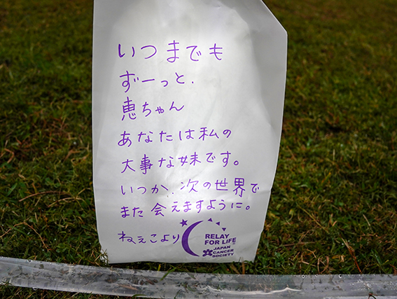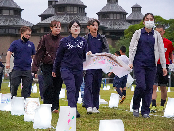 11月11日、12日に浦添市の浦添てだこ広場にてリレー・フォー・ライフ・ジャパン2023年おきなわが開催されました。このイベントは、がんサバイバー(がん経験者)、ケアギバー(ご家族、ご遺族、支援者の皆さん)を讃え、地域全体でがんと向き合い、そしてがん征圧を目指す年間を通じて取り組むチャリティ活動です。会場にはがんサバイバー、ケアギバーへのメッセージを書いた紙袋の中にLEDライトを入れた「ルミナリエ」が設置され、参加者はその周りのコースを歩きました。