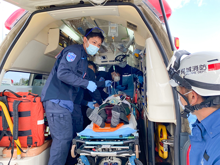 さらに当院では日本国内で唯一(2024年4月現在)、米国のEMS(EmergencyMedical Services:救急医療システム)専門医資格を持つ山内素直医師が、アメリカで培った経験とスキルを活かして地域消防や警察、海上保安庁などの関係機関と連携し、高度な医療を提供するドクターカーチームが院外の患者さんの元へ出動し、専門的な処置を行いながら病院へと搬送する体制の整備に取り組んでいます。