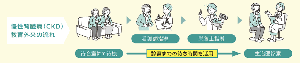 外来受診時に、診察の待ち時間を利用して看護師や栄養士が腎不全の進行を遅らせるために必要な日々の生活習慣の改善や食事療法を指導します。
